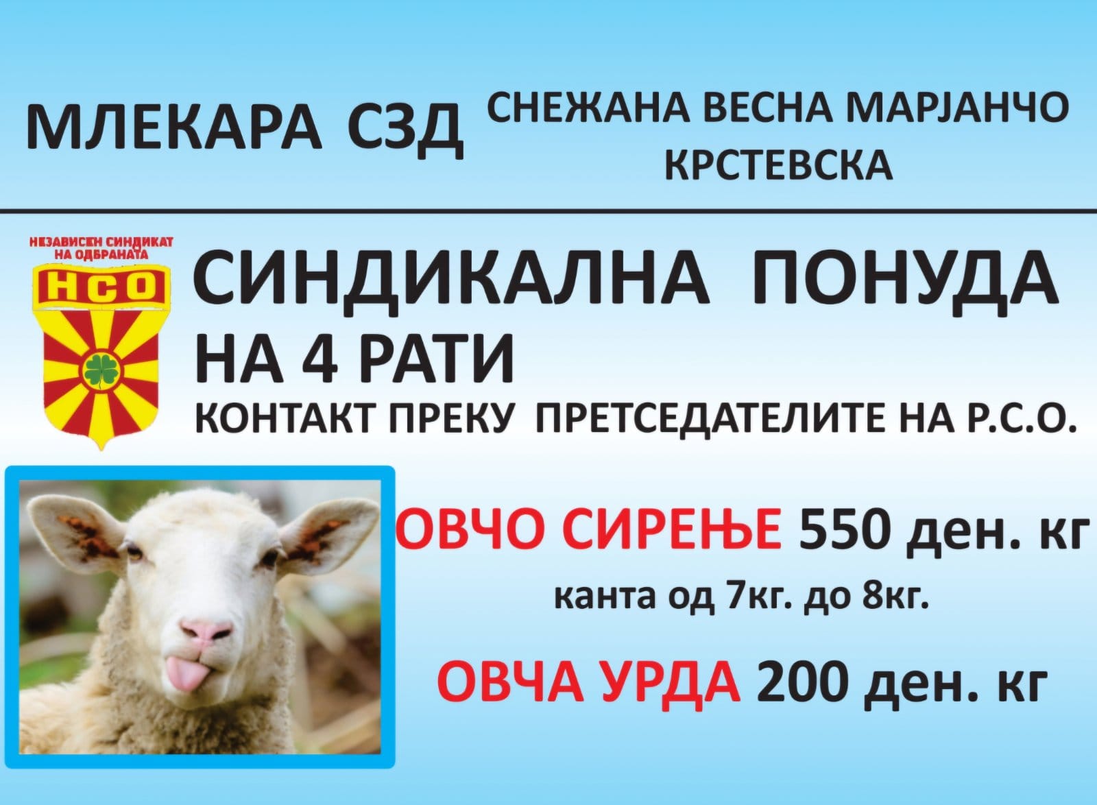 Оревче Агропромет на членовите на НСО им нуди ОВЧО БЕЛО СИРЕЊЕ, 100% Македонски прозвод, произвден од овчо млеко од македонски фармери, без млеко во прав, без додавање на растителни масти и млечни заменители. Понудата се состои во следното: –...